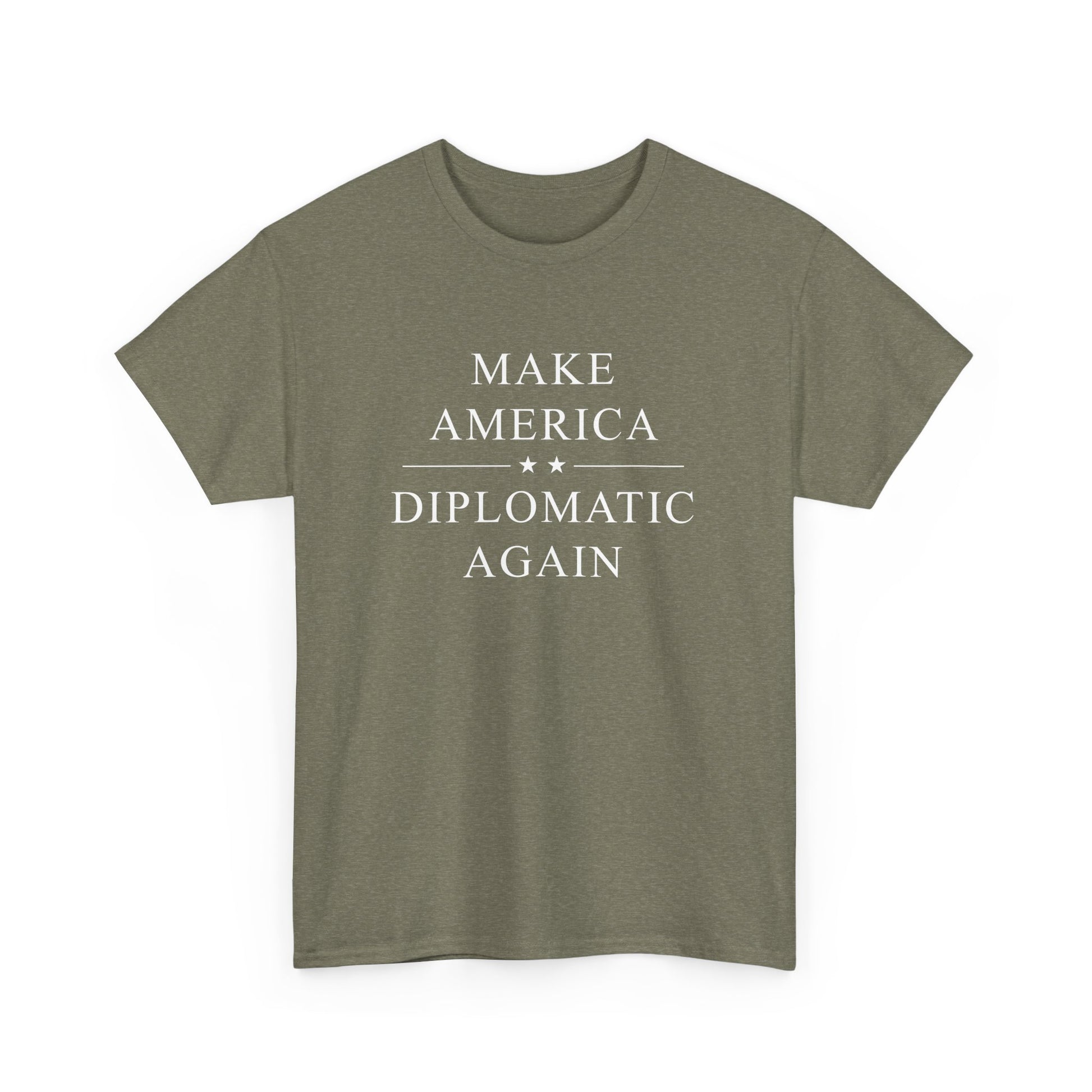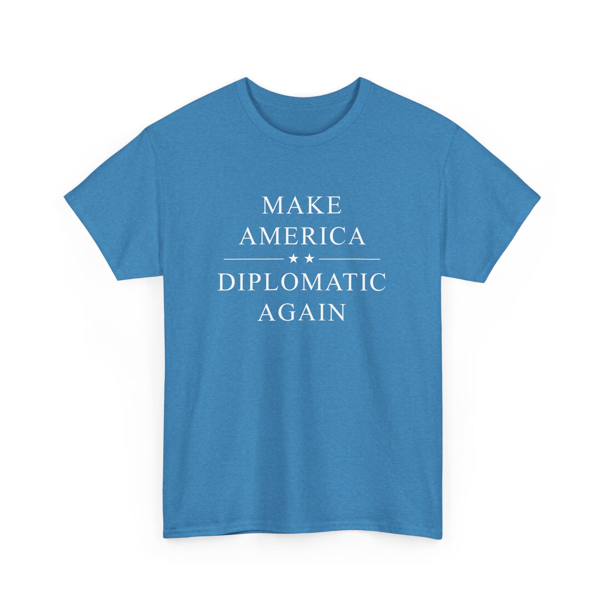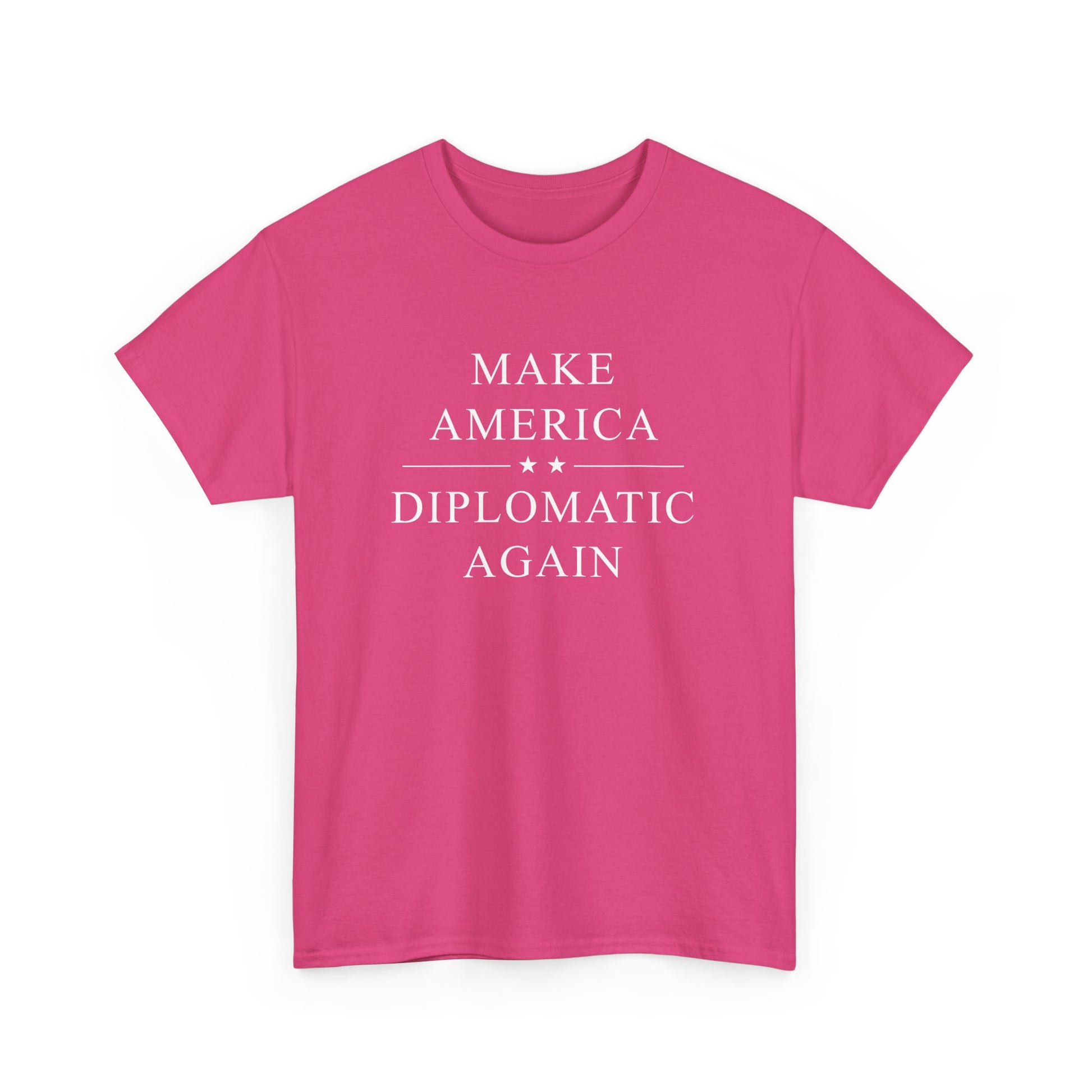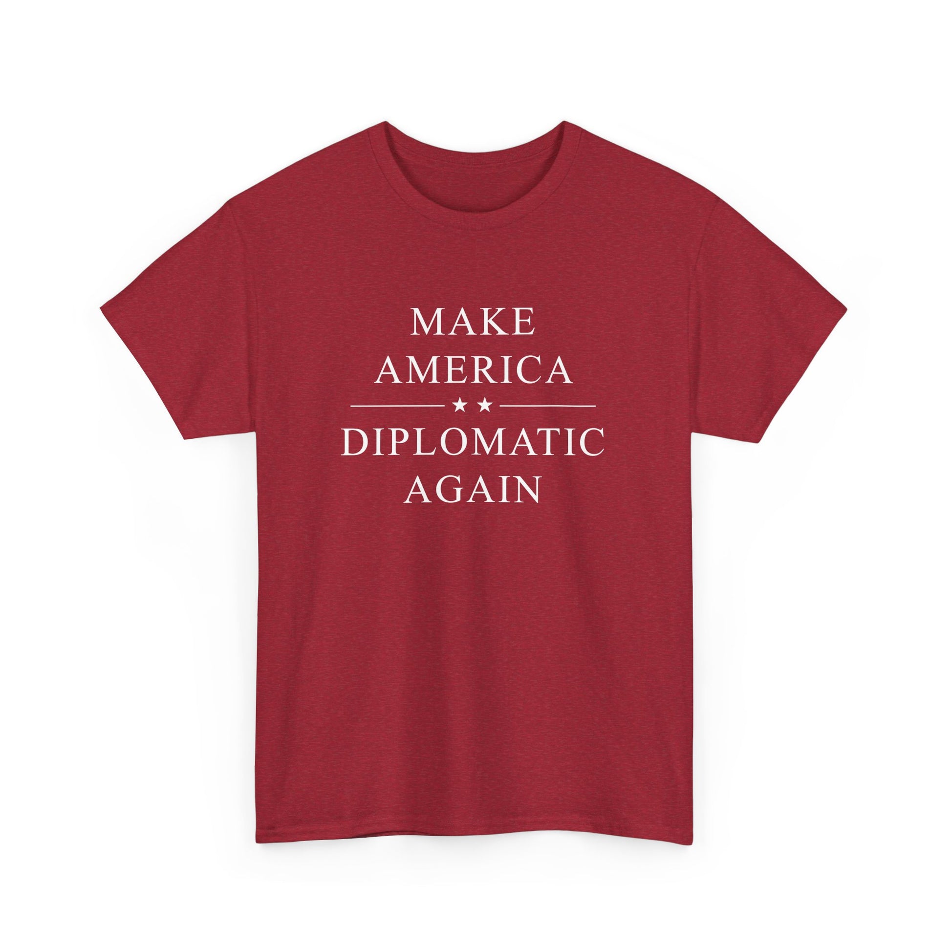 This political tee reads "Make America Diplomatic Again" and gives off a bold, statement-making vibe. It is perfect for those interested in political activism and discussions. Ideal for political rallies and everyday casual wear.